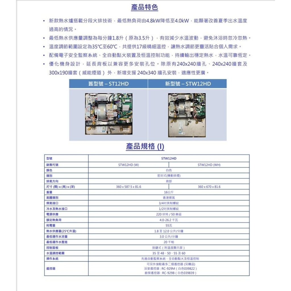 TGC STW12HD 12公升/分鐘 超薄型即熱式煤氣熱水爐是一款高效能、設計纖薄的家電產品。替換現有型號ST12HD.